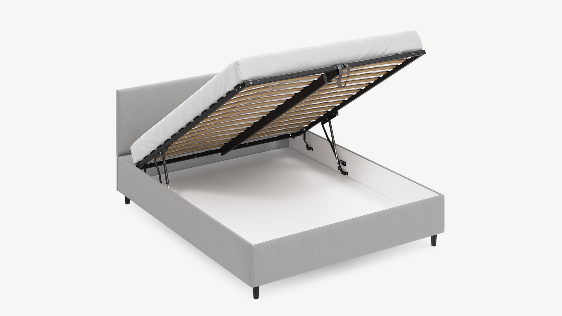 • Скрытая под основанием вместительная емкость без внутренних перегородок позволяет использовать всю площадь подкроватного пространства для хранения вещей.