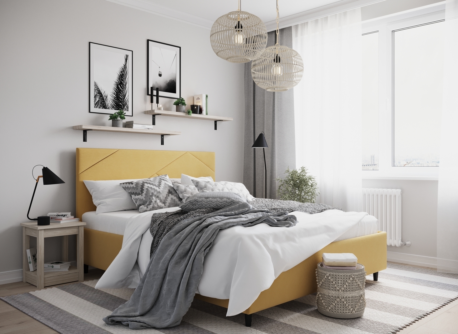 Создать гармоничный интерьер и завершить образ спальни помогут дополнительные аксессуары, например: тумбы, банкетки, подушки.