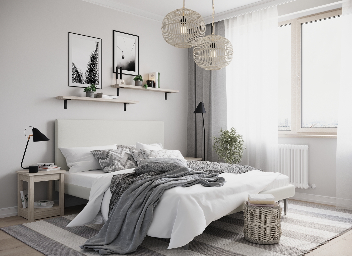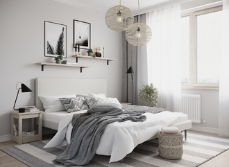 Создать гармоничный интерьер и завершить образ спальни помогут дополнительные аксессуары, например: тумбы, банкетки, подушки.