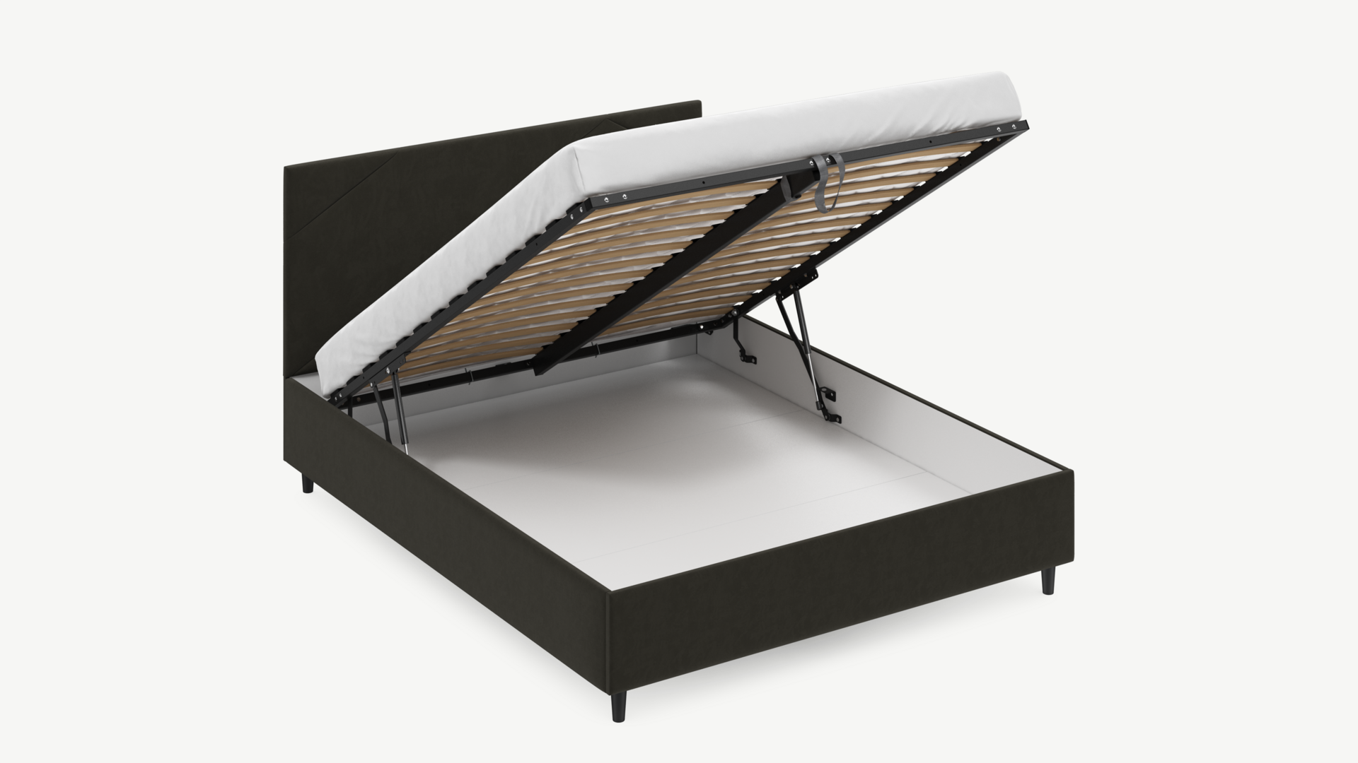 • Скрытая под основанием вместительная емкость без внутренних перегородок позволяет использовать всю площадь подкроватного пространства для хранения вещей.