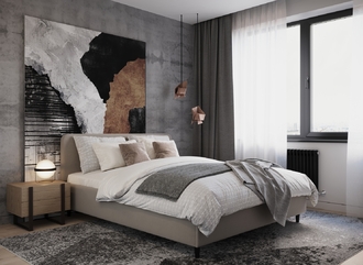 Царга, задающая пропорции, благодаря гладкости своей фактуры подчеркивает центральный элемент декора. Высокие опоры приподнимают фигуру кровати над полом и добавляют её образу визуальной легкости.