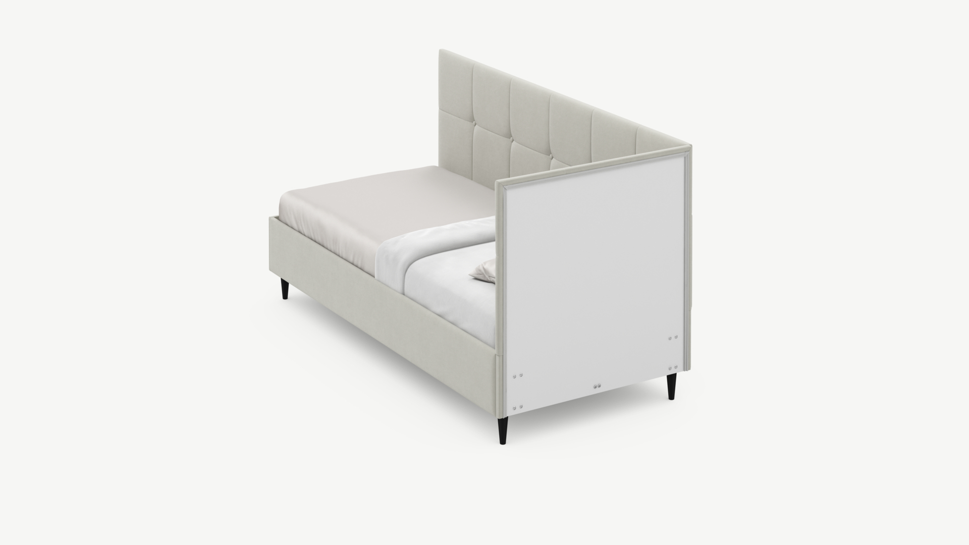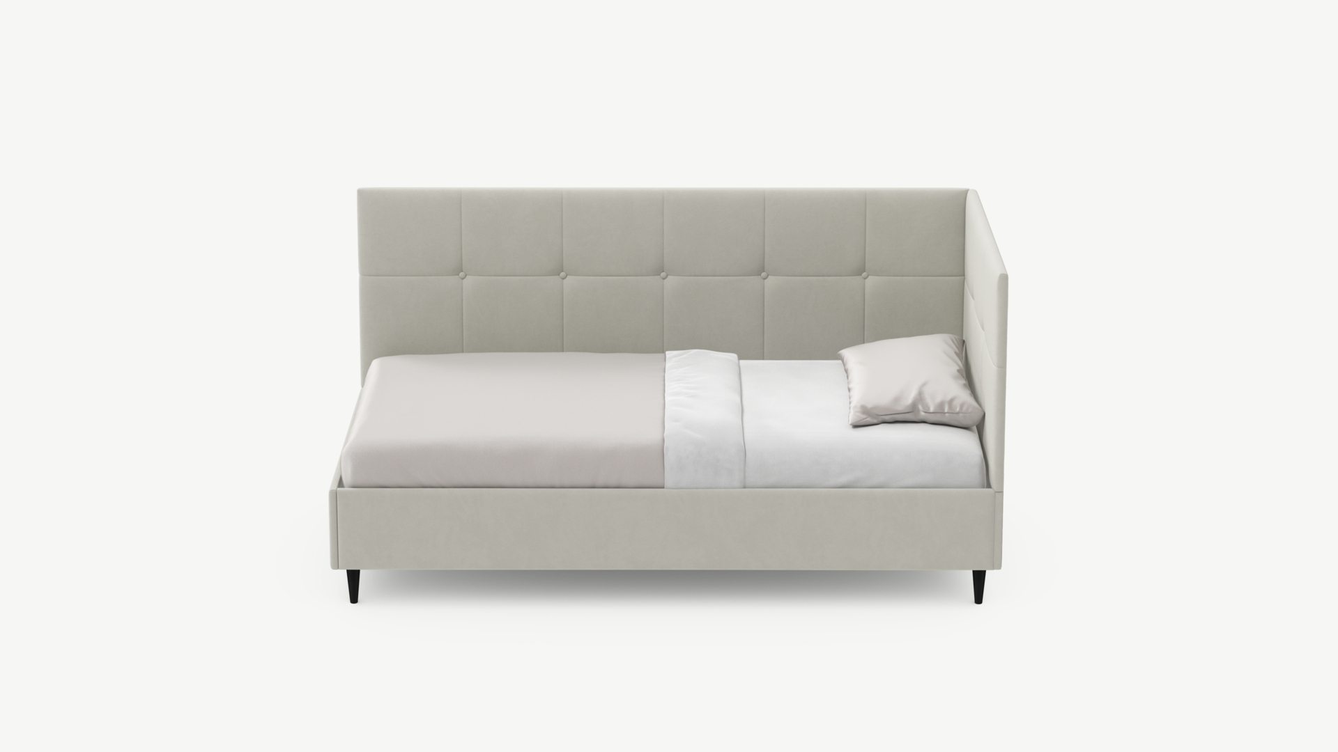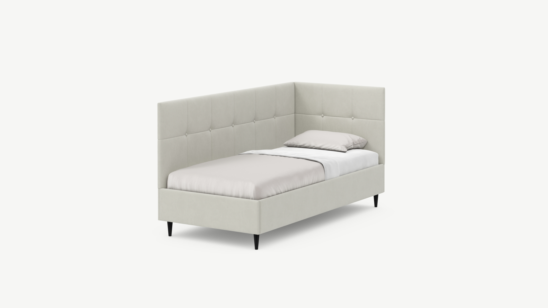 Угловая односпальная кровать MOON FAMILY 1261 с мягкой спинкой и изголовьем создаст в Вашей спальне ощущение уюта. Крупная квадратная стежка привносит в интерьер графических акцентов, а вставка из пуговиц наполняет пространство ощущением домашнего тепла.