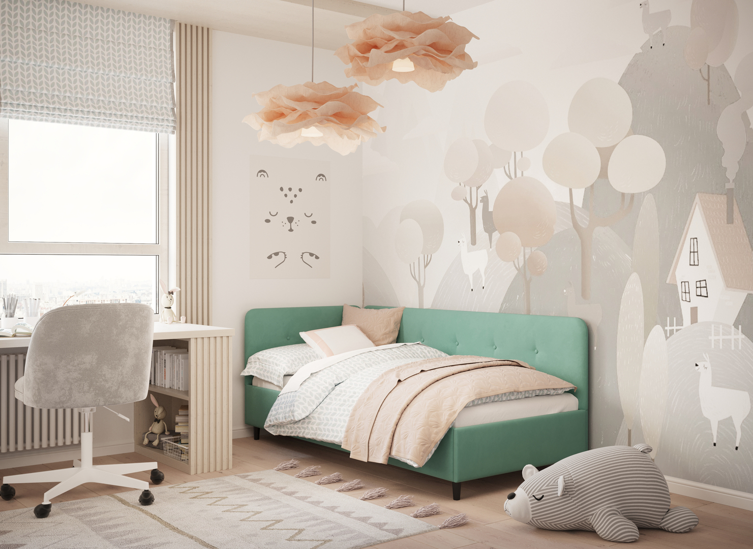 Угловая односпальная кровать MOON FAMILY 1253 с мягкой спинкой и изголовьем обладает округлыми формами, привносящими в интерьер нотки нежности. Изголовье, украшенное пуговицами, добавляет окружающему пространству шарм и уют. Высокие опоры придают кровати визуальной легкости, а также обеспечивают удобство во время уборки.