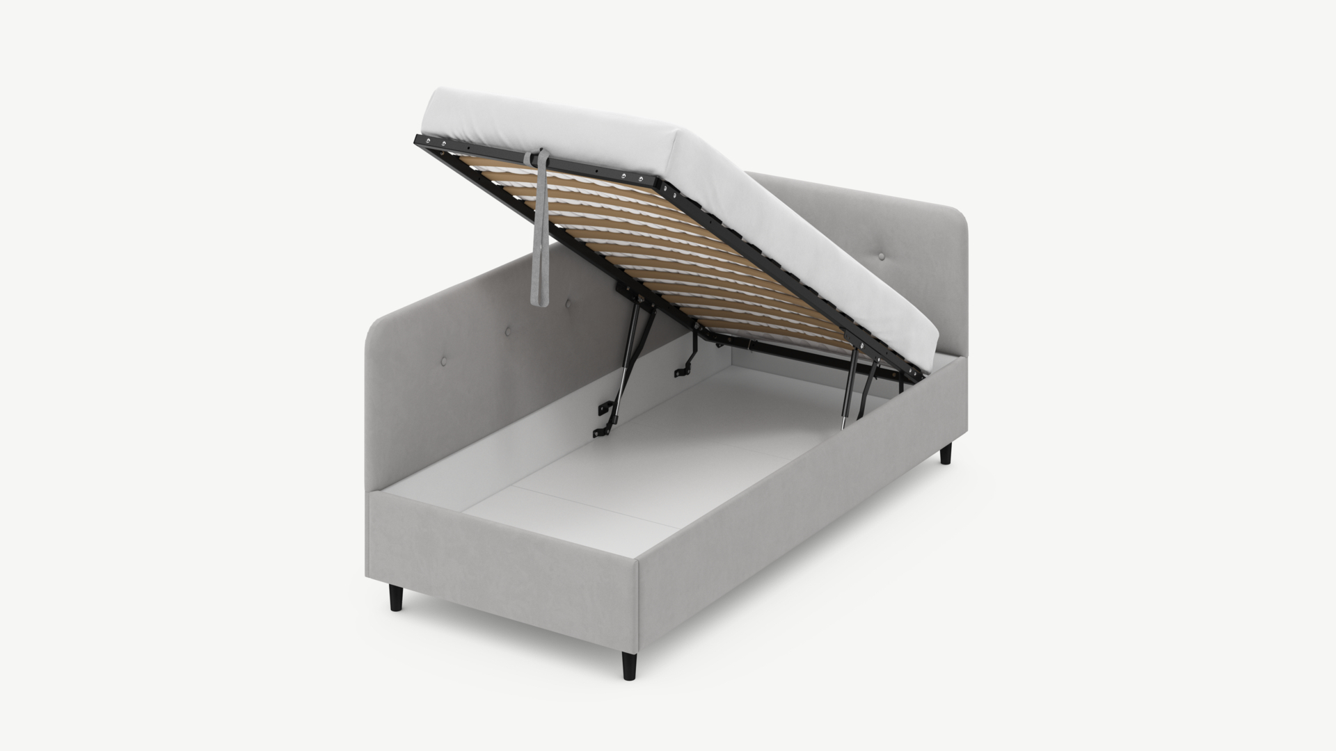 • Скрытая под основанием вместительная емкость без внутренних перегородок позволяет использовать всю площадь подкроватного пространства для хранения вещей.
