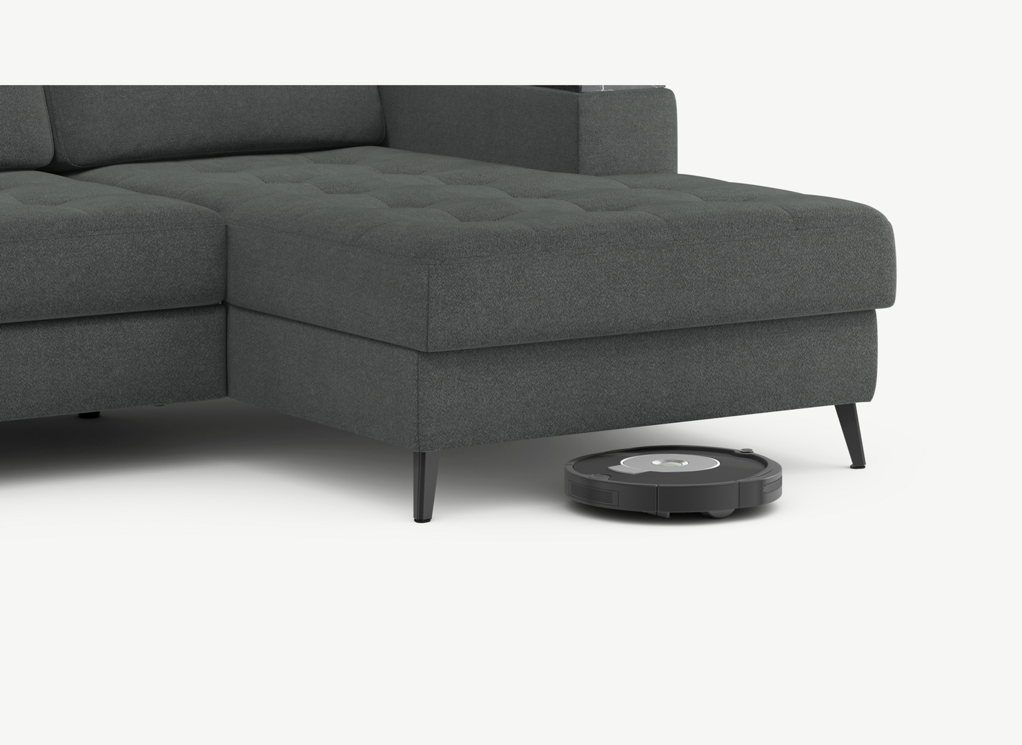 Благодаря высоким наклонным опорам под диваном проходит робот-пылесос и легко проводится влажная уборка, что обеспечивает чистоту и порядок в доме.