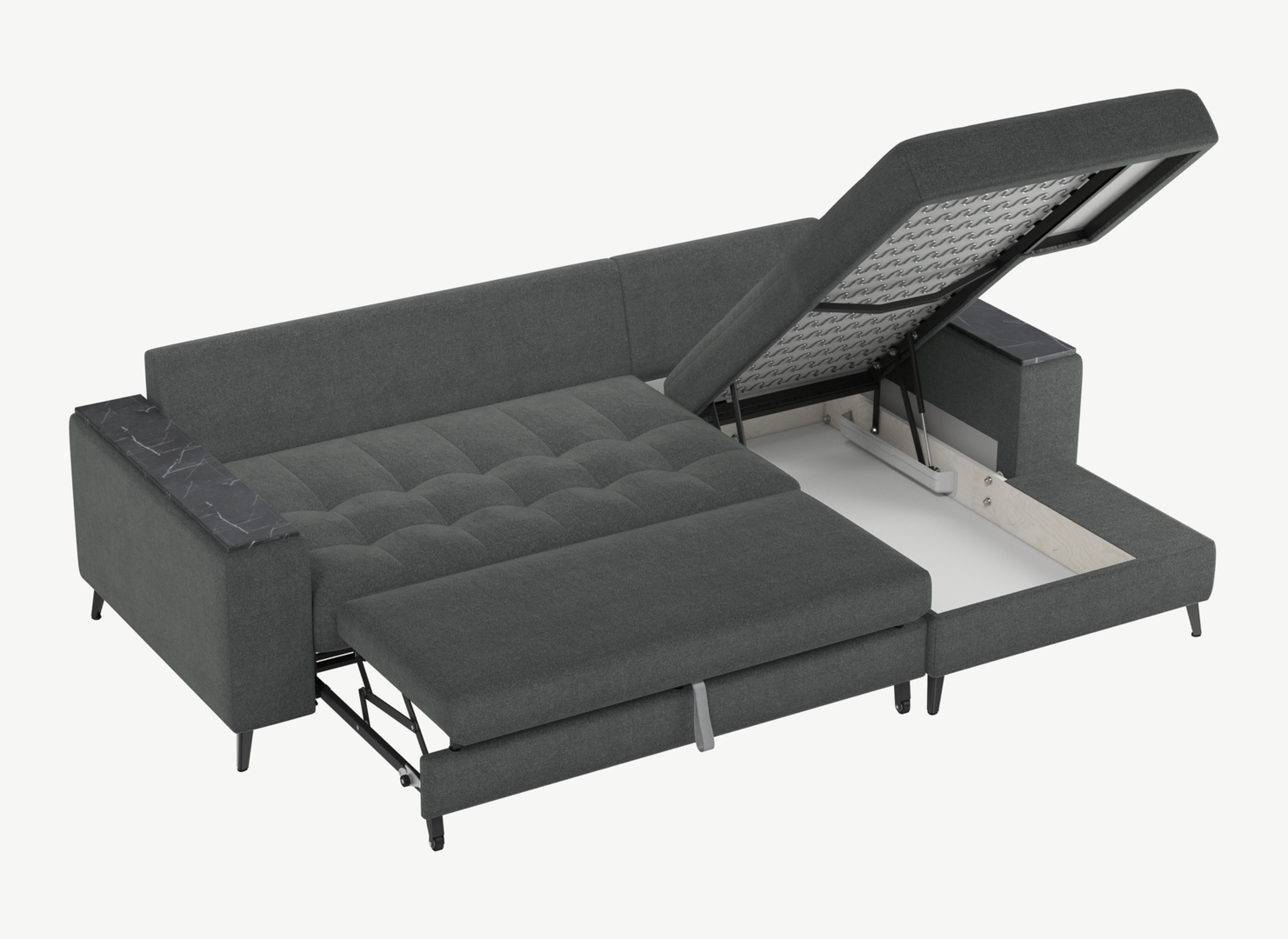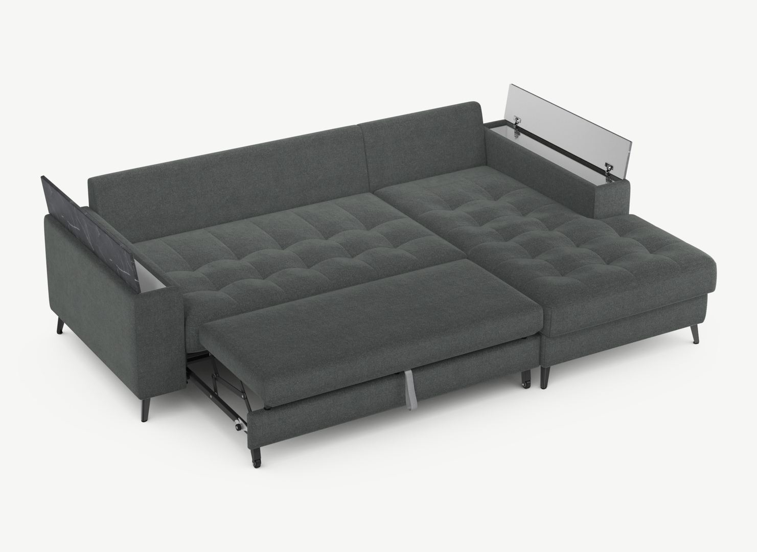 Секция «канапе» обеспечивает дополнительное пространство для отдыха, благодаря которому Вы можете располагаться с максимальным комфортом, удобно вытянув ноги. Под данной секцией расположен вместительный бельевой короб.